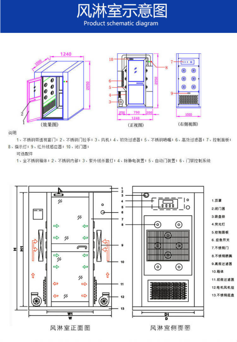 二、電機功耗小,此風(fēng)淋室設(shè)計是進入風(fēng)淋室吹淋,出門不吹淋,紅外線自動感應(yīng)開關(guān)控制吹淋,避免風(fēng)淋室無人空吹,多重節(jié)能。